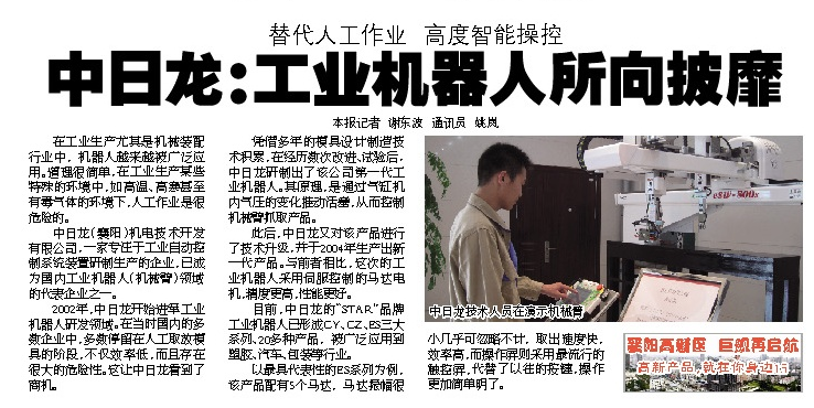 10月9日的楚天都市報(bào)襄陽版(楚天快報(bào)),刊發(fā)了關(guān)于我公司工業(yè)機(jī)器人的報(bào)道,請(qǐng)大家查閱。 另,后續(xù)還將繼續(xù)報(bào)道我公司的自動(dòng)化夾具。