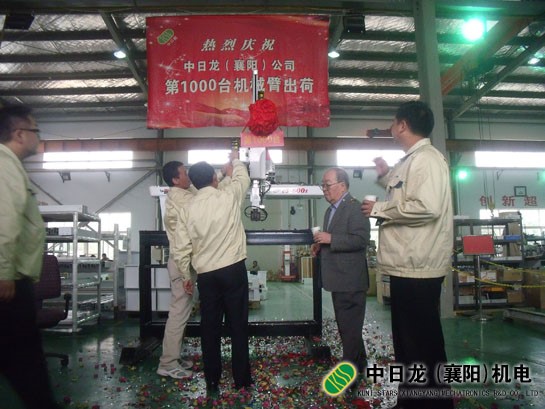 2011年10月19日下午,我公司舉行了第1000臺(tái)機(jī)械臂出荷慶典儀式。 從2010年9月第一臺(tái)機(jī)械臂量產(chǎn)出荷,經(jīng)過短短一年的時(shí)間,我們已經(jīng)成功從1臺(tái)跨越到1000臺(tái)!這標(biāo)志著我公司的機(jī)械臂生產(chǎn)規(guī)模,
