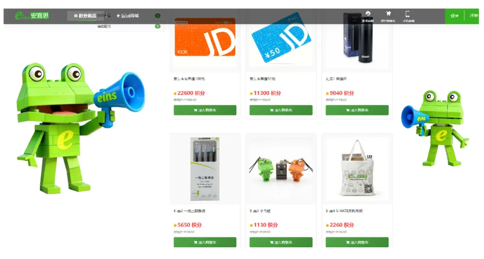 01點擊eins商城網(wǎng)站上方導航欄“積分商城”02進入后可以根據(jù)積分任意兌換啦