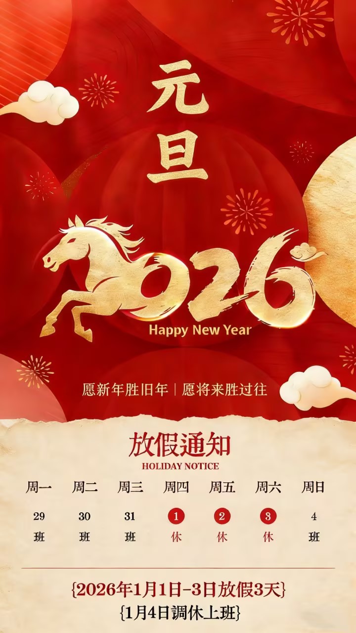 感謝大家一直以來的支持與協(xié)助,STAR集團根據(jù)年度放假安排于2026年1月1日(星期四)~1月3日(星期六)放假,1月4日開始正常上班。以上,敬請悉知,不便之處,敬請諒解!